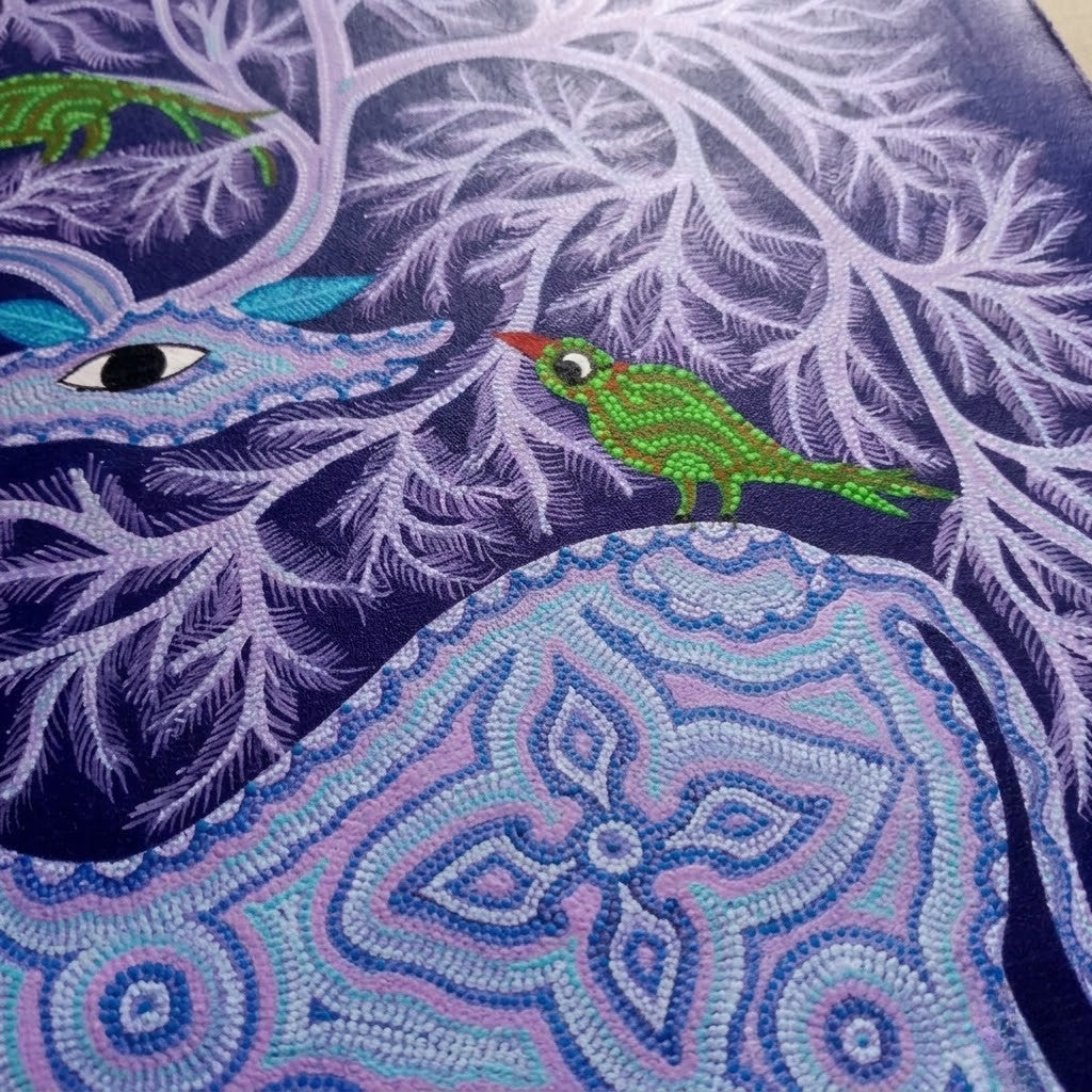 The deep indigo background holds the composition together while allowing the lighter patterned surfaces of the deer and tree to emerge clearly. From a distance, the work reads as a unified forest scene. Up close, the painting reveals thousands of small marks that record the steady discipline of the artist’s hand.