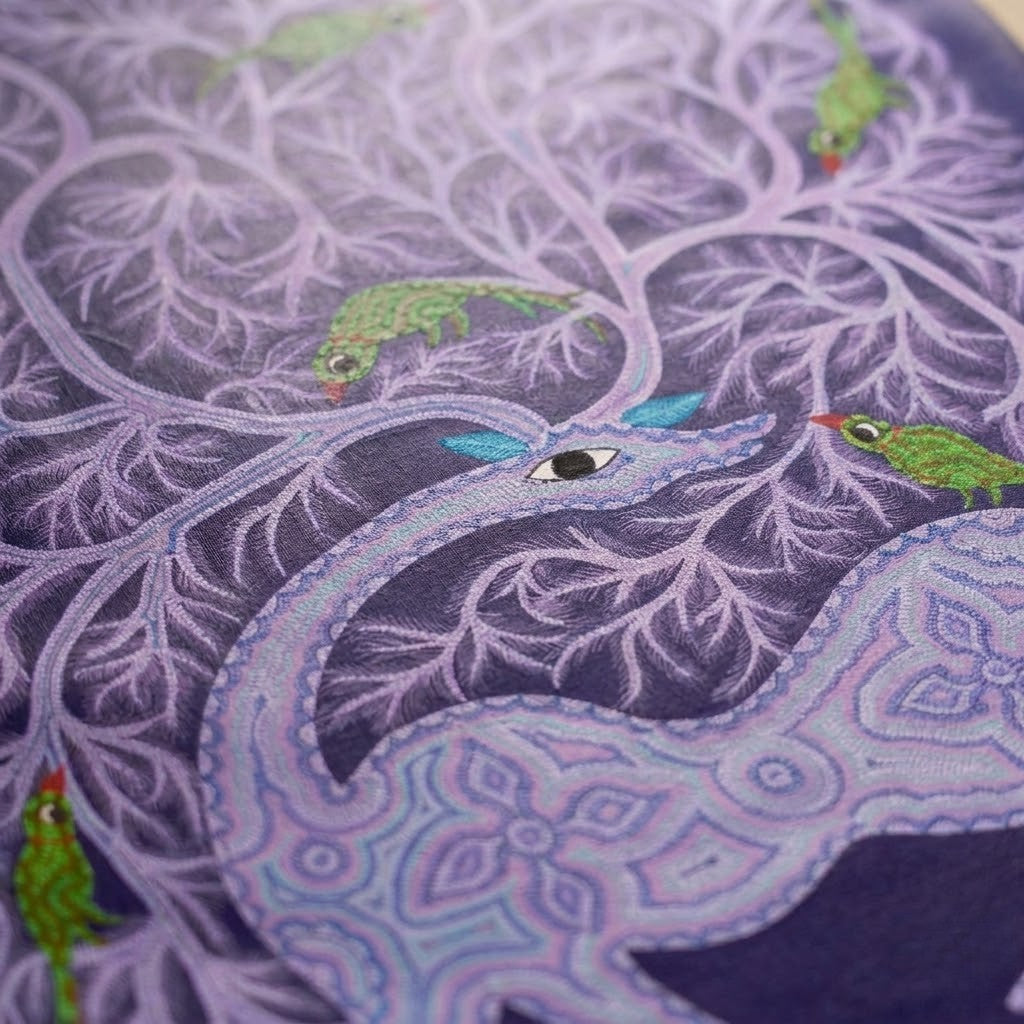 This work reflects the continuing practice of Pithora art from Chhota Udaipur, Gujarat, where Rathwa tribal painters preserve a visual language built through repetition, memory, and careful attention to the natural world.