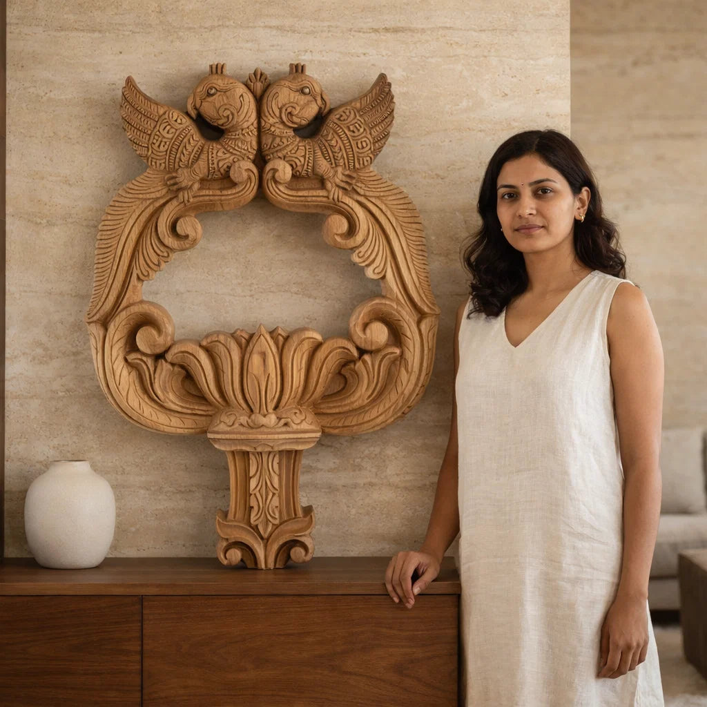 The parrot, a recurring motif in Indian wood carving, symbolizes narration, devotion, and continuity of memory. Here, the birds are not applied decoration but integrated into the structural curve of the frame.