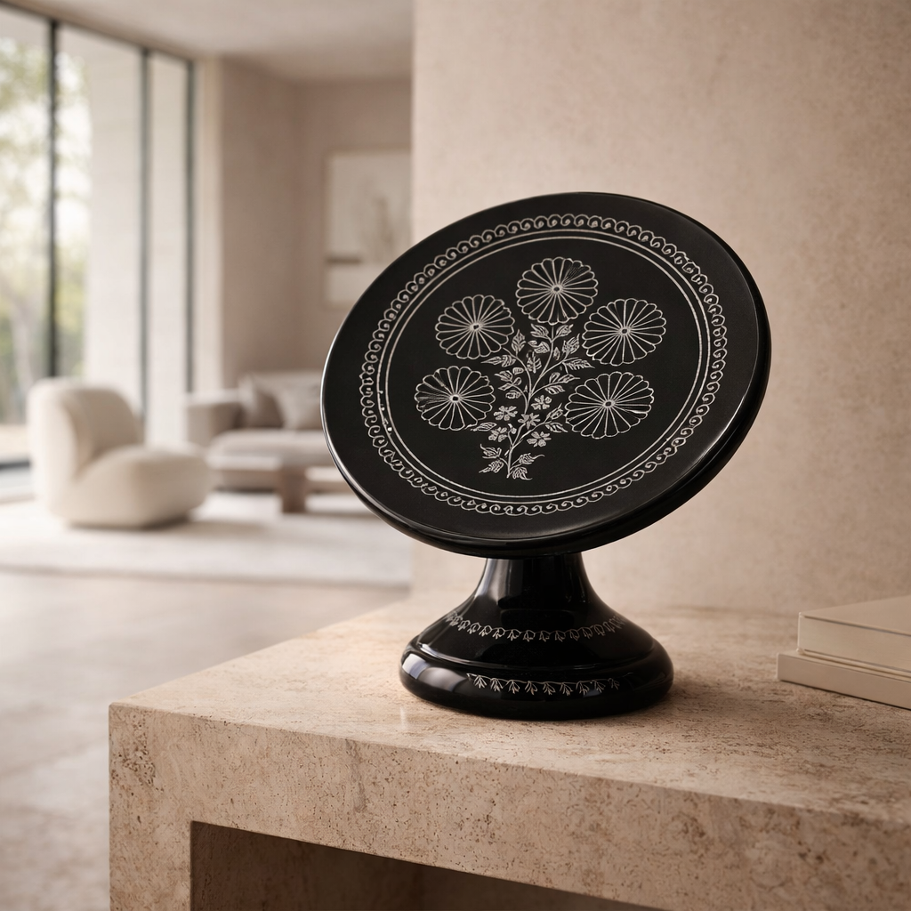 Pedestal Plate with Silver Inlay Medallion Design Handcrafted Black Pottery | Azamgarh Art
